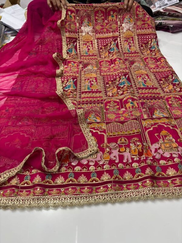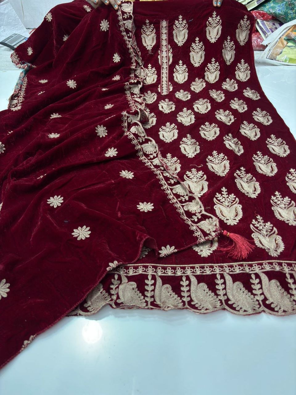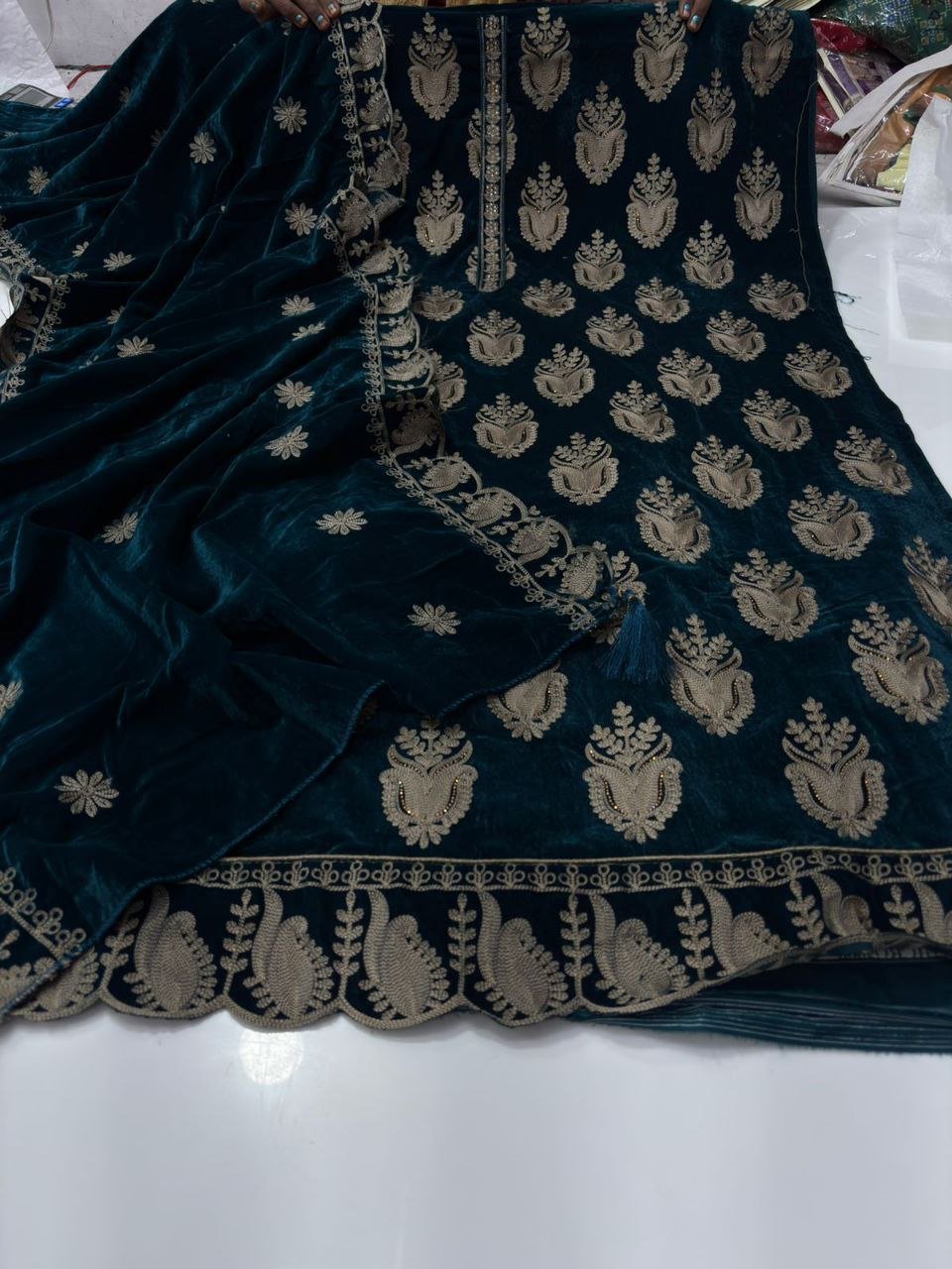 • Top (Shirt): Heavy Pure Velvet fabric adorned with rich Zari & Thread Embroidery all over the front panel – beautifully finished with a scalloped embroidered border.