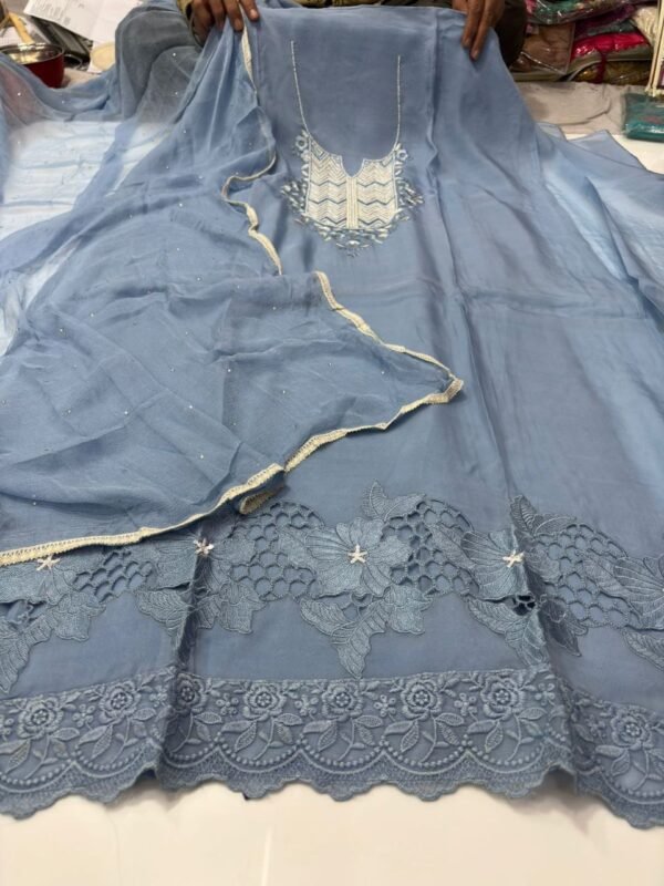 • Dupatta/Shawl: Elegant Velvet Shawl featuring intricate embroidery and floral motifs that perfectly complement the suit design.