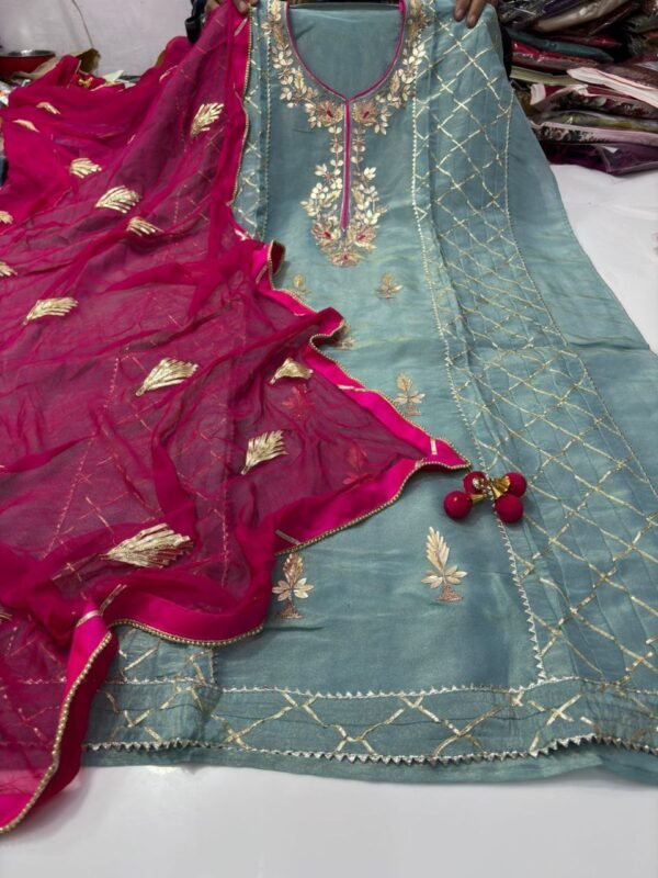 Design: Traditional heavy embroidered yoke with delicate motifs spread throughout