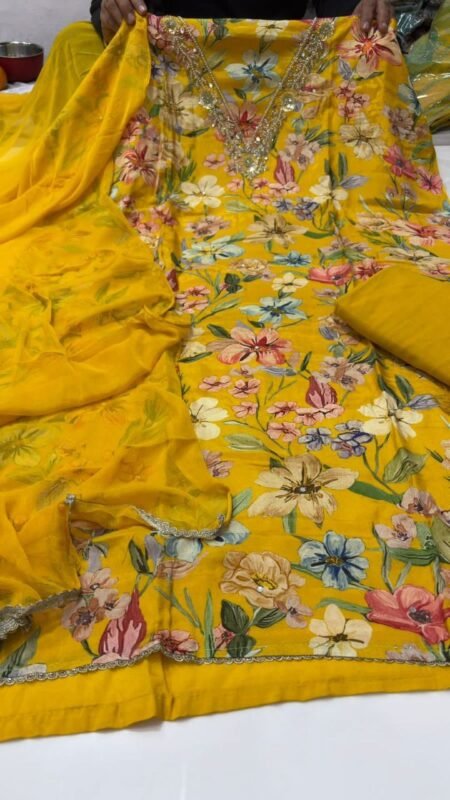 Work Type: Exquisite Kashmiri-style embroidery with multicolor thread and zari detailing on neckline and borders